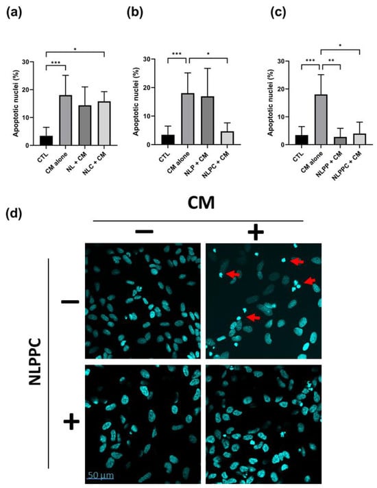 Neuroprotection of empty and curcumin-encapsulated NL formulations on differentiated SH-SY5Y WT neuronal cell line. Differentiated SH-SY5Y cells on slides were incubated for 24 h at 37 °C with 10 µg/mL empty (NL, NLP, or NLPP) or curcumin-loaded (NLC, NLPC, or NLPPC) formulations, followed by incubation for 24 h at 37 °C in the presence of CM containing Aβ peptide obtained from SH-SY5Y APP cells. Cells were washed, and fixed, followed by staining with DAPI and visualized using confocal microscopy to quantitate apoptotic nuclei. Results are shown for each formulation type ((a) NL, NLC; (b) NLP, NLPC; (c) NLPP, NLPPC). Representative images are shown in (d) for cells incubated in the absence and presence of CM or NLPPC, as indicated (fragmented nuclei are indicated with a red arrow). Results are shown as the mean number of apoptotic nuclei ± SD counted in n = 5 fields. (* p < 0.05, ** p < 0.01, *** p < 0.001; the control (CTL) and CM alone are identical and shown on each graph to indicate the comparisons of statistical significance).