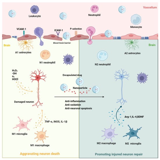 - Liu, S.; Xu, J.; Liu, Y.; You, Y.; Xie, L.; Tong, S.; Chen, Y.; Liang, K.; Zhou, S.; Li, F.; et al. Neutrophil-Biomimetic “Nanobuffer” for Remodeling the Microenvironment in the Infarct Core and Protecting Neurons in the Penumbra via Neutralization of Detrimental Factors to Treat Ischemic Stroke. ACS Appl. Mater. Interfaces 2022, 14, 27743–27761. [Google Scholar] [CrossRef]