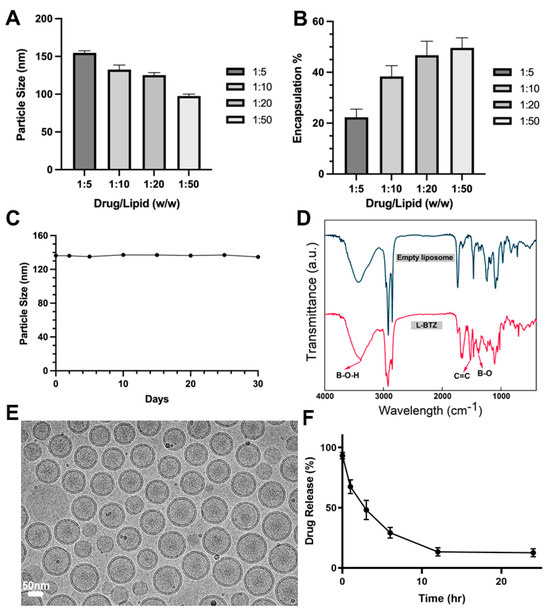 Particle size (A) and drug loading efficiency (B) of L-BTZ with varied drug-to-lipid ratios. (C) Measurement of particle size variations during the long-term storage. The results suggest L-BTZ remains stable at 4 °C for a period over 30 days. (D) Fourier-transform infrared spectroscopy (FTIR) of empty liposomes and L-BTZ. (E) Cryogenic transmission electron microscopy (cryo-TEM) analysis of the L-BTZ particles. Scale bar: 50 nm. (F) In vitro BTZ release profile in PBS at pH 6.0 for 24 h.