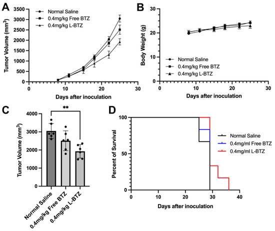 In vivo antitumor efficacy of L-BTZ in the NCI-H929 xenograft model. (A) Tumor volume of mice treated with normal saline, 0.4 mg/kg free BTZ, and 0.4 mg/kg L-BTZ. (B) Mean body weight of each treatment group throughout the treatment period. (C) Average tumor volume on day 25. ** p = 0.0017 for the 0.4 mg/kg L-BTZ treatment group when compared to normal saline cohort. (D) Kaplan–Meier survival curves.