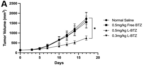 To explore the potential of L-BTZ as a general antineoplastic agent, the antitumor efficacy of L-BTZ was carried out on a Hepa1-6 HCC syngeneic model on C57BL/6 mice. Randomized mice were treated with either normal saline (as the control), 1.0 mg/kg in-house VELCADE® (free BTZ), 1.0 mg/kg L-BTZ, or 0.5 mg/kg L-BTZ intravenously once every three days for 5 doses. The tumor growth curves were shown in Figure 5, and the TGI of 1.0 mg/kg free BTZ, 1.0 mg/kg L-BTZ, and 0.5 mg/kg L-BTZ treatment groups (compared with the control) were 41.7% (p = 0.012), 58.0% (p = 0.007), and 35.7% (p = 0.033), respectively (Table 2). The result suggested that L-BTZ worked better than free BTZ at the same doses (1.0 mg/kg) and the efficacy was improved at a higher dose, within the tolerated toxicity region. Therefore, the therapeutic outcomes in the Hepa1-6 syngeneic model suggested that the liposomal BTZ has improved therapeutic efficacy in vivo compared to the free drug and has the potential to work as a broad spectrum anti-neoplastic agent not only against hematopoietic malignancies but also solid tumors.
