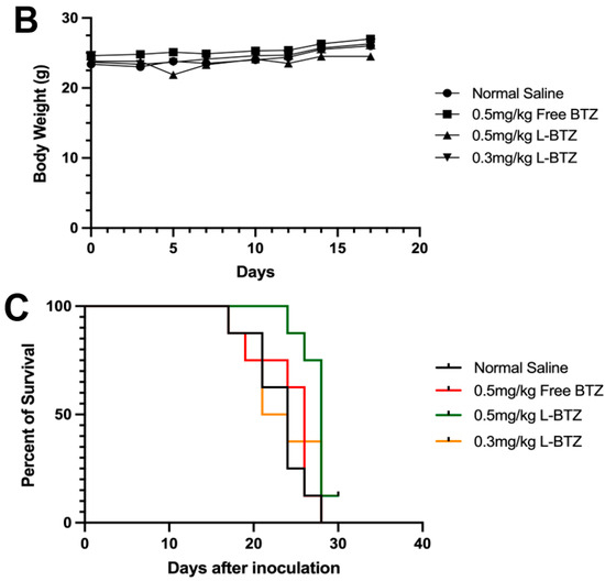 In vivo antitumor efficacy of L-BTZ in the OPM-2 xenograft model. (A) Tumor volume of mice treated with normal saline, 0.5 mg/kg free BTZ, 0.5 mg/kg L-BTZ, and 0.3 mg/kg L-BTZ. (B) Mean body weight of each treatment group throughout the treatment period. (C) Kaplan–Meier survival curves. * p < 0.05.
