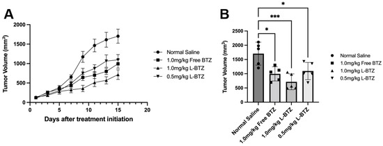 In vivo antitumor efficacy of L-BTZ in the Hepa1-6 syngeneic model. (A). Tumor volume of mice treated with normal saline, 1.0 mg/kg free BTZ, 1.0 mg/kg L-BTZ, and 0.5 mg/kg L-BTZ, (B). Average tumor volume on day 15. * p < 0.05, *** p < 0.001.
