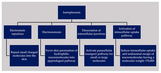 ItP is performed by applying a WEC on the skin’s surface using two electrodes (the cathode and anode), an electric controller, a power source, and a drug reservoir [74]. During ItP, the electricity flows from the electrode to the skin. This flow of electricity is associated with two electrochemical phenomena, namely electrostatic repulsion and electro-osmosis [49,50,75]. Electrostatic repulsion occurs when two similarly charged particles come into close proximity and repel each other [48]. During ItP, under the influence of a positive or negative electrode, positively charged or negatively charged molecules, respectively, migrate across the skin barrier [48]. Electrostatic repulsion is, therefore, the direct effect of the application of an electric current to charged molecules. Small charged molecules can penetrate through the intercellular space between skin cells via electrostatic repulsion. Conversely, electro-osmosis is defined as the convective solvent flow under the influence of electricity [76]. The electromigration of charged entities induces electro-osmosis during the flow of current. The outermost layer of the skin, the stratum corneum (SC), is recognized as a physical barrier to skin permeation [77,78]. However, SC does not exhibit a regular structure, and the electric resistance of the SC is not consistent throughout the SC [79]. It contains several skin appendages (e.g., hair follicles, sweat glands, and sebaceous glands) [80]. These appendages extend from the skin surface to the dermis or lower dermis layers [81]. During ItP, electro-osmosis preferentially occurs following the trans-appendageal pathway. Consequently, electro-osmosis favors an anodal ItP of positively charged molecules and passive diffusion of neutral molecules [49,50].