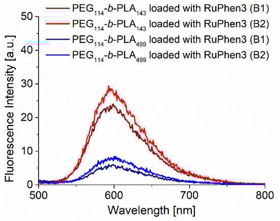 The apparent RuPhen3 concentrations indicated a higher loading, and consequently a higher encapsulation efficiency, for the PEG114-b-PLA143 micelles compared with the PEG114-b-PLA499 polymersomes. The estimated concentrations of RuPhen3 from fluorescence spectroscopy and the determined mass concentrations of assemblies are summarized in Table 3. Due to the potential quenching of RuPhen3 or energy transfer processes, these estimates may lead to underestimating the overall RuPhen3 concentration.