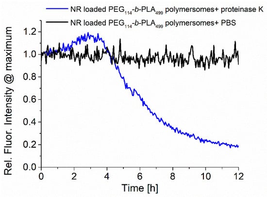 A similar behaviour could be observed for the enzymatic degradation of PEG114-b-PLA499 polymersomes loaded with the model dye Nile Red, as shown in Figure 6. The change in fluorescence emission around 620 nm showed a comparable increase within the first 3 h, followed by a rapid decrease due to the precipitation of insoluble Nile Red and polymer upon degradation of the polymersomes, as reported in the literature [33,34].