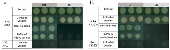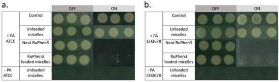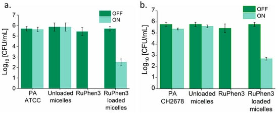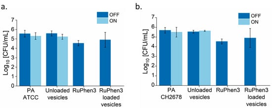 Bar plot of log10 CFU/mL calculated by the plate count method for (a) PA ATCC and (b) PA CH2678 incubated with neat RuPhen3 and RuPhen3-loaded vesicles for irradiated and non-irradiated samples (compare Figure 10). (Final neat (RuPhen3) = 93.45 µM, final (RuPhen3) in loaded vesicle solution = 93.45 ± 6.55 µM.) The samples were irradiated for 30 min (ON) or incubated in the dark for 30 min (OFF). Absence of bar: no countable colonies. The error bars correspond to the standard deviation of technical replicates (n = 3).