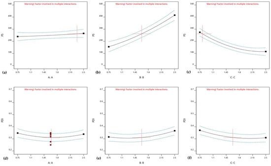 According to the statistical analysis, CER-NP (factor A) is not significantly effective on both the particle size and PDI value (p = 0.7028 and 0.6571). However, cholesterol (factor B) and oleic acid (factor C) were significantly effective on the particle size and PDI value (p < 0.05). The one-factor analysis shows the individual effect of each factor on particle size and PDI values. The one-factor analysis is provided in Figure 2. Figure 2a,d shows the insignificant effect of CER-NP on particle size and PDI values. Figure 2b,e explains the point that the cholesterol increase raised the particle size and PDI value. The increase in oleic acid reduced the particle size and PDI value, as shown in Figure 2c,f.
