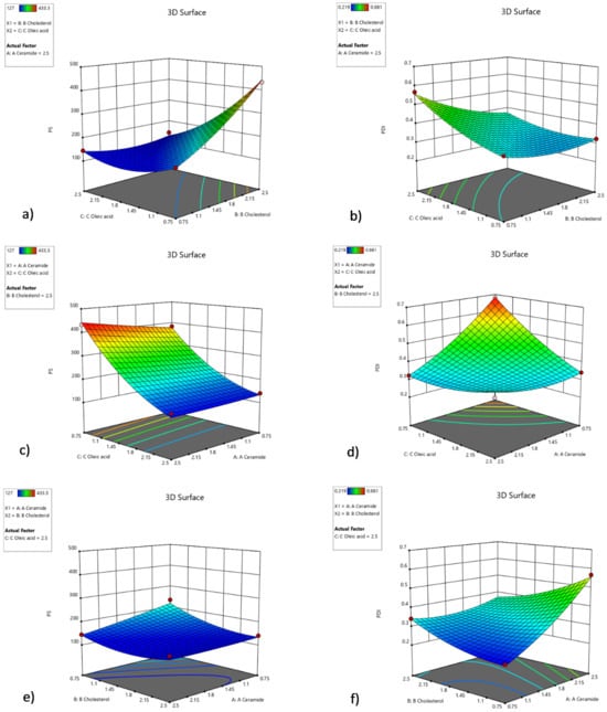 Three-dimensional response surface graphs show the effects of the relations of ingredients. Figure 3a shows the effect of relations between oleic acid and cholesterol; meanwhile, CER-NP amount is maximized. Figure 3c indicates that oleic acid has a crucial effect on particle size in maximized cholesterol with any levels of CER-NP. The maximum amount of oleic acid can keep the particle size under control in many levels of cholesterol and CER-NP based on Figure 3e. Figure 3b shows that the PDI value was controlled by cholesterol in maximized CER-NP with any levels of oleic acid. However, the CER-NP and oleic acid may have an optimum ratio to obtain a minimum PDI value in the maximum level of cholesterol, according to Figure 3d. When oleic acid is maximized, an increasing amount of cholesterol can reduce the PDI value at a maximum level of CER-NP in Figure 3f.