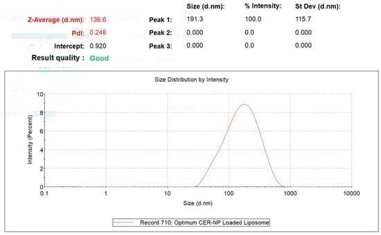The experimental particle size and PDI data of optimized liposomes, which performed at least three replications, were 136.6 ± 4.05 d.nm and 0.248 ± 0.012, respectively. As a result, the experimental responses were in close agreement with the predicted responses. The DLS result of the optimum CER-NP-loaded liposome is provided in Figure 4.