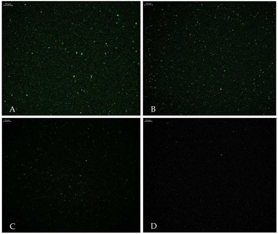 The optimized liposomes prepared with various molar concentrations of NBD-CER instead of CER-NP have been observed in CLSM. The fluorescent nitro group of NBD-CER is inevitably shown in a vesicle structure. The CLSM images are provided in Figure 5. The NBD-Cer amount was evaluated based on CLSM figures. Figure 5A contained the highest molar concentration of NBD-Cer. Figure 5B–D may contain less localized fluorescent areas rather than Figure 5A [44].
