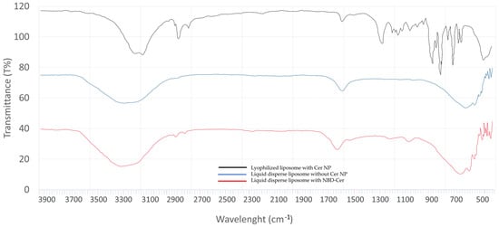 The ATR-IR spectroscopy was carried out with NBD-CER containing optimized liposomes in comparison to the empty liposome at 20 runs. Lipoid S100, cholesterol, and oleic acid were analyzed to control the functional group region specifically. The wavelength was in the range of 400–4000 cm−1. The transmittance was observed at a percentage in the range of 0–100. The IRAffinity-1S Fourier Transform Infrared Spectrophotometer (Shimadzu Corporation, Kyoto, Japan) was used in the analysis. The spectral data were evaluated in LabSolutions IR Software (Shimadzu Corporation, Kyoto, Japan).