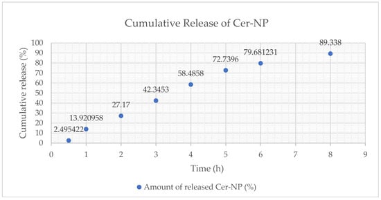It is well-known that liposomes provide a sustained drug release via lipid bilayer. Therefore, the in vitro CER-NP release from liposomes is crucial to observe the CER-NP release rate as a function of time. In vitro release of CER-NP from optimized liposomes was evaluated based on the cumulative released percentage of CER-NP from liposomes. As was seen in Figure 9, more than 50% of CER-NP was released from the optimum liposome until the 6th hour. Almost the entire amount of the CER-NP (89%) was released at the end of the 8 h. The release rate was calculated at 0.54 ± 0.013 (k, µg.cm−2·h−1).