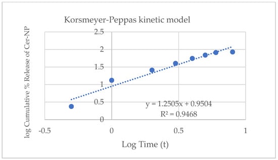 In the literature, there are many cases in which the drug release from liposomes fitted the Korsmeyer–Peppas kinetic model [63,65,66]. The CER-NP release from optimized liposomes showed a similar release pattern as reported in the literature.