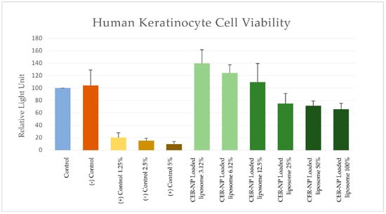 MTT assay; RLU values of each group as cell viability sign on cytotoxicity tests. Control is a non-treatment, (−) control is a liposome without CER-NP, and (+) control is SLS at distinct concentrations. Optimum CER-NP-loaded liposome series are obtained via dilution. The final CER-NP molar concentration is provided below the figure.