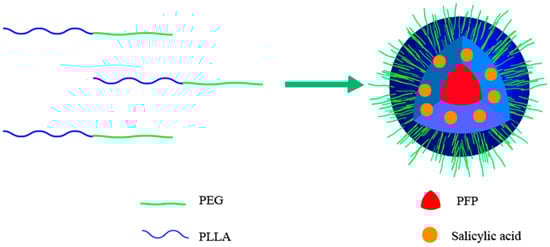 PEG-PLLA (50.0 mg) was dissolved in 1 mL of a chloroform solution containing two drops of Span 80. Then, 30.0 mg of salicylic acid was dissolved in 0.5 mL absolute ethyl alcohol, which was mixed with the copolymer solution, and 500 μL of PFP was added to the mixed solution in an ice bath. Subsequently, the hybrid solution was stirred vigorously at 12,000 rpm for 5 min to form a coarse emulsion. Then, the obtained emulsion was added drop by drop to a 0.5% sodium dodecyl sulfate solution (5 mL) under the action of ultrasound at 195 W in an ice bath, and sonication lasted for 5 min under these conditions. Finally, the resulting liquid was stirred for 24 h at room temperature. The PEG-PLLA nanoparticles encapsulating salicylic acid and PFP were centrifuged and dispersed in a normal saline solution.