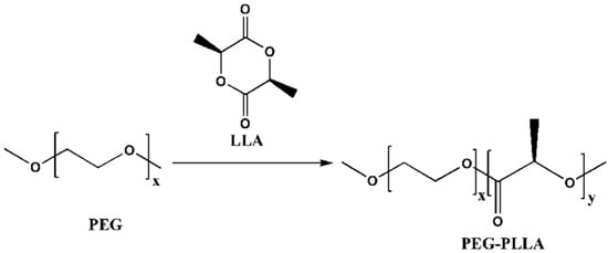 A certain amount of L-lactide (recrystallized three times with ethyl acetate), PEG6000 and stannous octanoate (the molar ratio was 100:1:1) were added into a 50 mL round-bottom flask. Then, the mixture was reacted for 2 h in an oil bath at 120 °C under the protection of dry high-purity nitrogen. The obtained product (PEG-PLLA) was dissolved in chloroform and precipitated in excess cold diethyl ether. Finally, the sediment was separated and dried for 24 h under vacuum conditions at 40 °C. The procedure was repeated three times. The route of synthesis is shown in Figure 2.