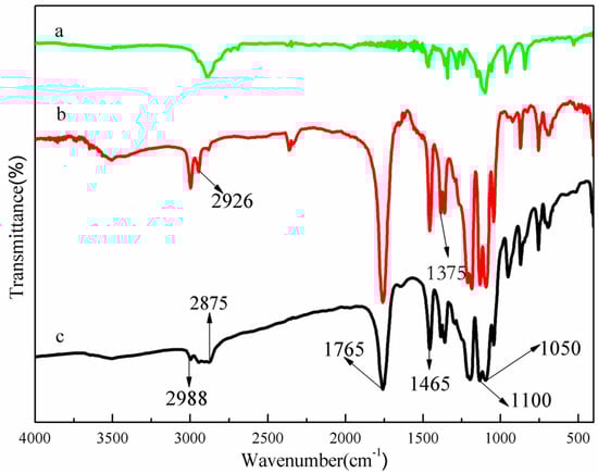 The infrared spectra of PEG, PLLA, and PEG-PLLA are shown in Figure 3. Compared with the IR spectra of PEG, a new strong absorption peak corresponding to the carbonyl group stretching vibrations was observed in the IR spectra of the PEG-PLLA copolymer at approximately 1765 cm−1; weak stretching bands of -CH3, -CH2, and -CH were observed at 2988 cm−1, 2875 cm−1, and 2926 cm−1, respectively; and the band at 1100 cm−1 was attributed to asymmetrical stretching of the C-O-C ester, which provided evidence of the formation of the ester group. The peaks at 1465 cm−1 and 1375 cm−1, respectively, corresponded to methylene and methyl, and the wavenumber at 1050 cm−1 corresponded to the stretching vibration band of C-O. Based on the above results, it could be concluded that the copolymer of PEG-PLLA was successfully synthesized.