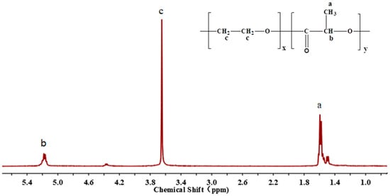 The 1H-NMR spectrum of PEG-PLLA is shown in Figure 4. The peak at about 1.5 ppm was a chemical shift (δ) of the -CH3 group in the PLLA main chains, which presented as a double peak. The chemical shift of the -CH group in the PLLA main chains was 5.2 ppm due to the effect of the adjacent carbonyl group. The characteristic peak of –CH2 in the PEG chains was observed at 3.6 ppm, which was affected by the electron-absorbing effect of the O atom. These results confirmed the successful preparation of PEG-PLLA. In addition, the peak area in the H-NMR spectrum was proportional to the number of H, and the molecular weight of PEG was 6000. The molecular weight and degree of polymerization of PLLA could be calculated based on the 1H-NMR spectrum of PEG-PLLA. Finally, the polymerization degree of PLLA was estimated to be 207, and its molecular weight was about 14,904.