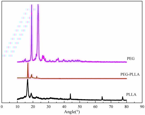 The XRD patterns of PLLA, PEG, and PEG-PLLA are shown in Figure 5. The diffraction peaks of PLLA mainly appeared at 16.7°, 19.2°, and 22.5°, indicating that the PLLA mainly formed α crystals. The 2θs of PEG were mainly 19.2° and 23.4°, which suggested that the PEG polymer displayed a monoclinic crystal. Compared with PLLA, the diffraction peaks at 16.7°, 19.2°, and 22.5° for the PEG-PLLA copolymer changed slightly; however, the diffraction peaks at 44.2°, 64.3°, and 77.4°disappeared entirely, indicating that the addition of PEG destroyed the crystal structure of PLLA, causing a decrease in the orderliness of the PLLA molecules.