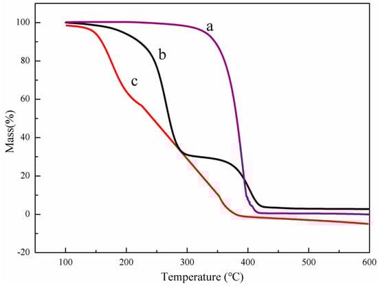 TGA curves of PEG (a), PEG-PLLA (b), and PLLA (c). The thermal weight loss of the sample at different temperatures can be observed within 100–600 °C.