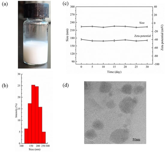 The nanoparticle suspension was uniform and milk-white, as shown in Figure 7a. The average diameter of the PEG-PLLA@SA·PFP nanoparticles was measured by a Malvern laser particle size instrument, as shown in Figure 7b. The average size of the nanoparticles was 223.8 ± 2.5 nm, and the PDI (polydispersity index) was 0.153 ± 0.020, indicating that the particle size of the nanoparticles was relatively uniform. The zeta potential of the nanoparticles was a negative charge of −39.6 ± 1.9 mV. The PEG-PLLA@SA·PFP nanoparticles were stored in the refrigerator at 4 °C for 30 days to assess their stability by measuring their diameter and potential with dynamic light scattering. As shown in Figure 7c, there was no significant variation in the diameter or zeta potential over the course of 30 days (0, 5, 10, 15, 20, 25, and 30 days), which confirmed that the PEG-PLLA@SA·PFP nanoparticles were relatively stable. TEM images of the PEG-PLLA@SA·PFP nanoparticles are shown in Figure 7d.