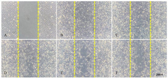 Effects of the PEG-PLLA copolymer on the migration of C6 cells. (A) Cultured for 0 h, (B) control group cultured for 24 h, (C) sample group (0.25 μg/μL) cultured for 24 h, (D) sample group (0.5 μg/μL) cultured for 24 h, (E) sample group (0.75 μg/μL) cultured for 24 h, (F) sample group (1.00 μg/μL) cultured for 24 h.