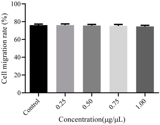 The cellular migration ratio of the control group (without PEG-PLLA) was 76.15 ± 1.16%, and the sample groups of test concentrations (0.25, 0.5, 0.75, and 1.00 μg/μL) were respectively 76.10 ± 1.35%, 75.64 ± 1.22%, 75.29 ± 1.62%, and 74.61 ± 1.25% (n = 4). Statistical testing found the results showed no significant differences (p > 0.05), as shown in Figure 10.