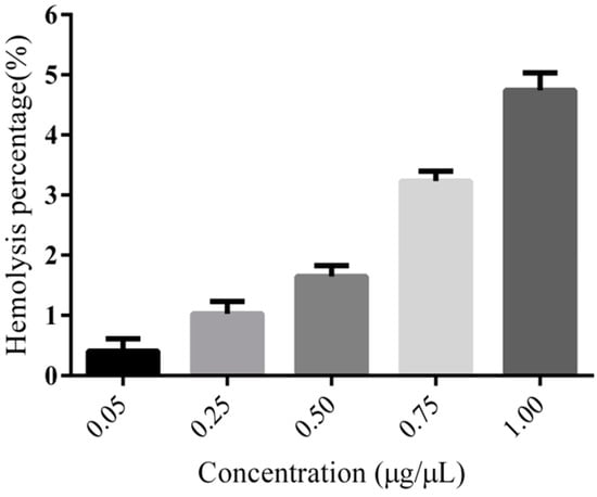 Hemolysis is a dangerous condition where blood cells rupture in circulation, which can eventually lead to jaundice and anemia. Many natural and synthetic nanoparticles have been found to cause hemolytic action. Therefore, evaluating the hemolytic properties of potential pharmaceutic materials is significant for assessing their biocompatibility. As shown in Figure 11, the hemolysis percentages of all samples at concentrations ranging from 0.05 to 1.0 μg/μL were less than 5%, indicating that the PEG-PLLA is safe for erythrocytes and could be used as a pharmaceutic adjuvant.