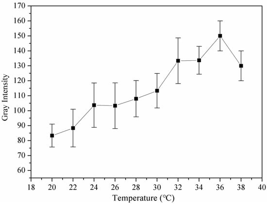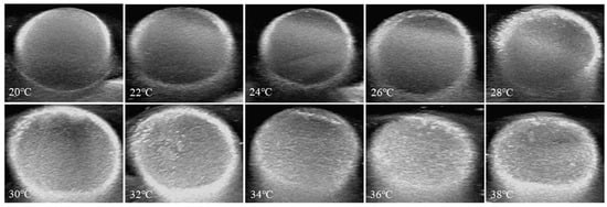 The nanoparticle solution was placed in a sealed finger of a latex glove, which was immersed in a thermostatic water bath. The initial temperature of the water bath was set at 20 °C, and after two minutes at constant temperature, the ultrasonic probe touched the latex gloves to collect an image. Then, the temperature was raised to 22 °C and maintained for two minutes, and an image was taken. Similarly, the temperature was gradually increased to 38 °C, and images were collected separately. As shown in Figure 12 and Figure 13, there was a dark area in the image managed at 20 °C, and the contrast was lower. However, as the temperature gradually increased, more bright spots appeared in the images, and the difference was significantly improved. However, when the temperature was 38 °C, the intensity of the signal began to decrease. These results demonstrated that the nanoparticles were well-suited for imaging at 37 °C.