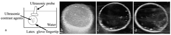 A sealed finger of the latex glove containing about 3 mL of the nanoparticle solution was immersed in water at 37 °C. An ultrasonic imaging system was used to record contrast-enhanced images on B-mode with a 10 MHz probe. Then, saline and the coupling agent were respectively poured into the fingers of the gloves and images were collected under the same experimental conditions. The results are shown in Figure 14. These results showed that the nanoparticles took on an excellent ultrasonic contrast enhancement ability (Figure 14b). However, saline and the coupling agent (Figure 14c,d), which were used as blank control groups, exhibited no ultrasonic contrast enhancement.