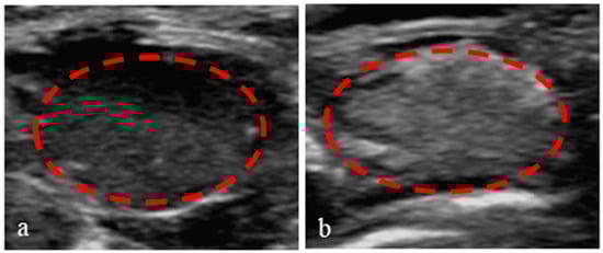 To verify the enhanced imaging contrast of PEG-PLLA nanoparticles injected into tumors in vivo, a subcutaneous tumor model of nude mice was successfully prepared. Then, 150 μL nanoparticle solution was injected into the tumors. All contrast images were recorded in the B-mode, with low persistence, a frame rate of 136 Hz, and a mechanical index of 0.4. As shown in Figure 15, there were many dark spots in the ultrasonic images before the injection (Figure 15a), but the contrast of the subcutaneous tumors image was distinctly enhanced after the injection, and the tumors became bright (Figure 15b). This accumulation of nanoparticles can be attributed to their enhanced permeation and retention effect in solid tumors. In addition, the borders between the tumors and normal tissues were more noticeable. These results demonstrated that the nanoparticles could improve the ultrasonic imaging contrast of tumors. These ultrasound images provide a non-invasive method to monitor the accumulation of nanoparticles in subcutaneous tumor tissue in vivo. This technique can be used to assess the targeting ability of different nanoparticles systems and their therapeutic effects on tumors in preclinical studies.