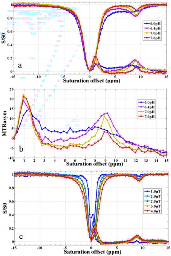 As shown in Figure 16 and Figure 17, the pH and intensity of a saturated RF pulse had a significant effect on the CEST signal strength. According to Figure 16a,b and Figure 17b, it was demonstrated that the intensity of the CEST signal first increased and then decreased as the pH increased. When the pH was about 6.4, the intensity was the strongest. Meanwhile, it was also noted that as the intensity of the RF pulse increased, the CEST signal became stronger, as shown in Figure 16c and Figure 17a. In addition, the signal intensity of water protons irradiated by a saturated RF pulse (S) compared with not irradiated (S0) also increased. The S of all samples in the experiment reduced to 0 at 0 ppm. In the meantime, it was shown that the CEST signal at about 9 ppm was caused by the proton chemical exchange of –COOH on the salicylic acid.