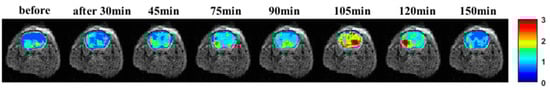 Figure 18 displays CEST images in vivo of PEG-PLLA nanoparticles encapsulating perfluoropentane and salicylic acid. Before the intravenous injection of nanoparticles into the mice in this experiment, the brain glioma appeared dark when analyzed by a magnetic resonance scanner, which demonstrated that the signal was lower and the imaging had poor contrast. After the intravenous injection of the nanoparticles, the intensity of the signals began to increase. The strongest signal was at 105 min, and then the intensity began to decrease. This suggests that these nanoparticles have the potential to be used as a contrast agent to enhance the contrast of CEST images for accurate diagnoses of diseases.