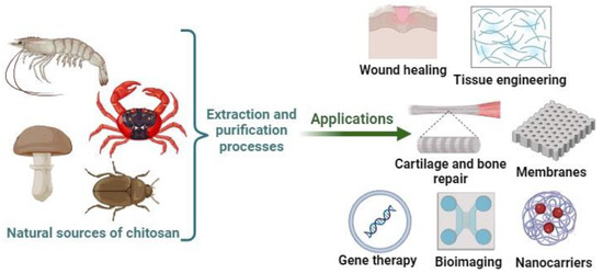 Biomedical applications of chitosan (created with BioRender.com, accessed on 25 September 2023).