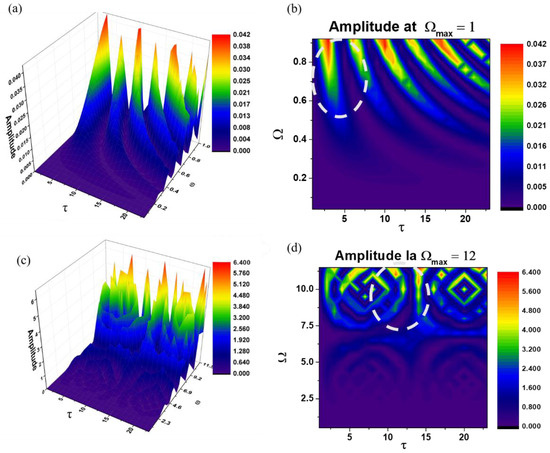 It should be noted that h can be obtained as a natural result of harmonic mapping from a typical Euclidian space to SL(2R) [32,33]. Figure 2a,b illustrates the dependencies of on the dimensionless coordinates and of Ω for the two values imposed by means of . These graphs show the morphologies of the leaching channels during biodegradation, as shown in Figure 2c,d.