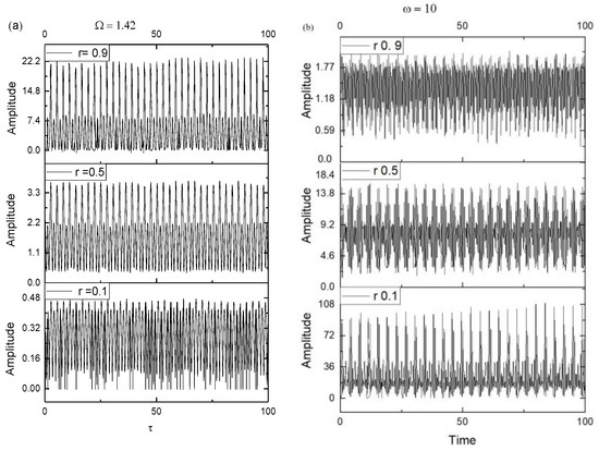 Plot of dependence as a function of for r = 0.1, 0.5, and 0.9. Graph (a) shows a double period regime which Ω = 1.0, and graph (b) shows the intermittency regime where Ω = 10.