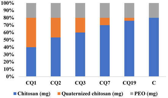 Composite chitosan/quaternized chitosan fibers were produced according to a previously reported procedure [45]. Briefly, a 2.5% ternary solution was prepared from chitosan, quaternized chitosan, and PEO dissolved in 75% acetic acid, at room temperature, keeping the percent of PEO constant while varying the chitosan/quaternized chitosan ratio (Figure 4); this was then subjected to electrospinning (Tong Li Tech Tl-Pro-Bm equipment). The following parameters were used: distance between tip and collector was 12 cm, speed of rotary drum collector was 800 rpm, flow rate was 0.2 or 0.3 mL/h, room temperature was 25 °C, and the voltage varied from 8 to 10 kV to obtain a Taylor cone. An infrared lamp was placed at 20 cm from the collector in order to aid the faster drying of the fibers. The compositions of the fibers and their codes are shown in Figure 4. PEO was removed by washing with ethanol, and the fibers were dried under vacuum.