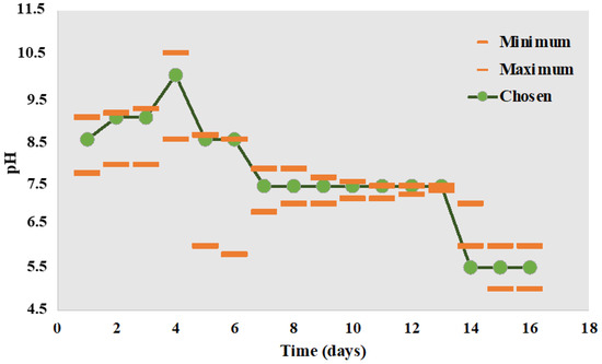 Graphical representation of the pH at different moments during the biodegradation experiment, adapted to fit the pH of wound exudate over the wound healing; (orange marks show the maximum and minimum values of pH determined from clinical trials; green marks represent the pH values chosen for this study) [54].