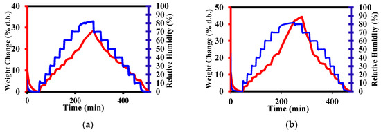 The behaviour of the samples in media of variable humidity was assessed using a fully automated gravimetric analyzer (IGAsorp by Hiden Analytical equipment) at 25 °C, with relative humidity (RH) between 0 and 90%, and an increase of 10% humidity steps, following a standard protocol [25]. The morphology of the fibers before and after degradation was monitored using images acquired with a Scanning Electron Microscope (SEM) Verios G4 UC (Thermo Fisher Scientific, Waltham, MA, USA) and a Polarized Optical Microscope (POM) Zeiss Axio Imager M2. The average fibers’ diameter was determined with the ImageJ software 1.53p (ImageJ bundled with 64-bit Java 1.8.0_172).