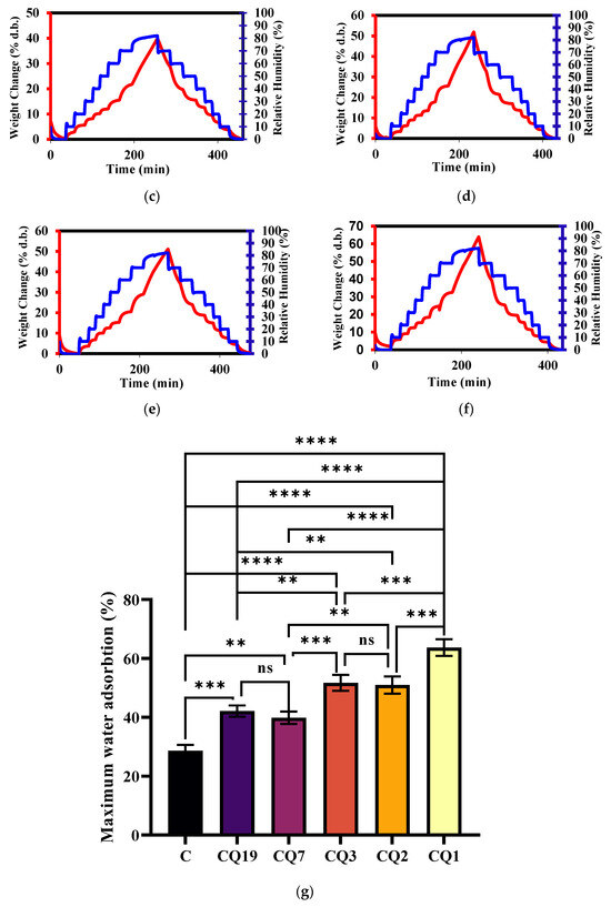Dynamic vapor sorption of the (a) C, (b) CQ19, (c) CQ7, (d) CQ3, (e) CQ2, and (f) CQ1 samples over the increasing/decreasing humidity, and (g) statistical representation of the maximum vapor sorption of the samples (** p ˂ 0.01; *** p ˂ 0.001; **** p ˂ 0.0001, ns—not significant).