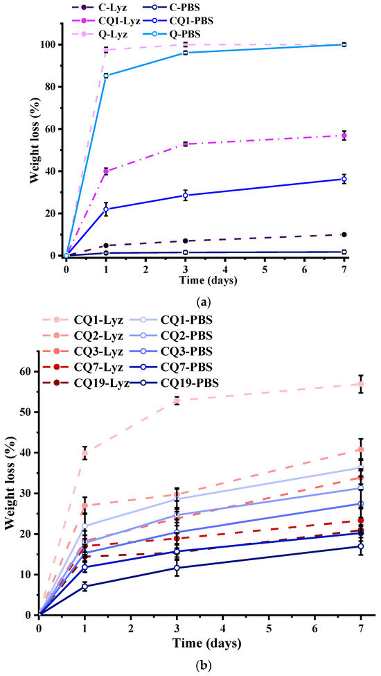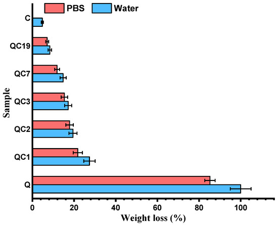 To understand the factors influencing the swelling behavior, processes that can occur in wet media, such as dissolution and biodegradation, were firstly investigated. The dissolution of the CQ fibers was also investigated in water and PBS. The solubility of the fibers increased with the Q content in both media, in accordance with their good water solubility [26].