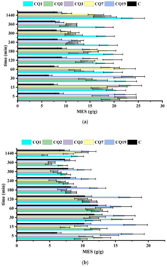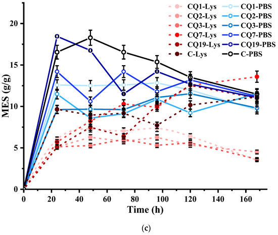 In PBS, a decreasing swelling trend over time was observed (Figure 10b), in accordance with the lower ability of chitosan fibers to swell in basic media after Q leaching [51]. By adding lysozyme to PBS, the swelling ability decreased over time, reflecting the advanced erosion of the fibers due to the scission of chitosan chains and dissolution of the resulting oligomers [52,53]. In fibers with high Q content, a lower MES value than that in fibers with low Q content (CQ7 and CQ19) or no Q (C) was recorded. This was attributed to advanced fiber erosion and subsequent inferior capacity to accommodate solvent molecules. However, overall, the swelling ability was well-preserved, with a swelling degree of approximately 5 g/g even after 7 days. In contrast, the CQ7 and CQ19 fibers showed an improvement in swelling ability over time, reaching a swelling degree of approximately 12 g/g, which was higher than that in the absence of lysozyme (Figure 10c). These values indicate the fibers as suitable dressings for healing the dry-to-light exuding wounds and light-to-moderate exuding wounds, respectively [66].