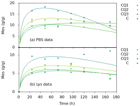 Equation (27) represents the fitting of the experimental data shown in Figure 11, indicating the possible validation of our theoretical model. As can be seen, the data are fitting very well for the chitosan/quaternized chitosan fibers. For the neat chitosan nanofibers, the model fit well only over the first hour. This is probably due to the compactness of the fibers in the absence of Q leaching, which hindered the access of lysozyme into fibers and retarded the degradation.