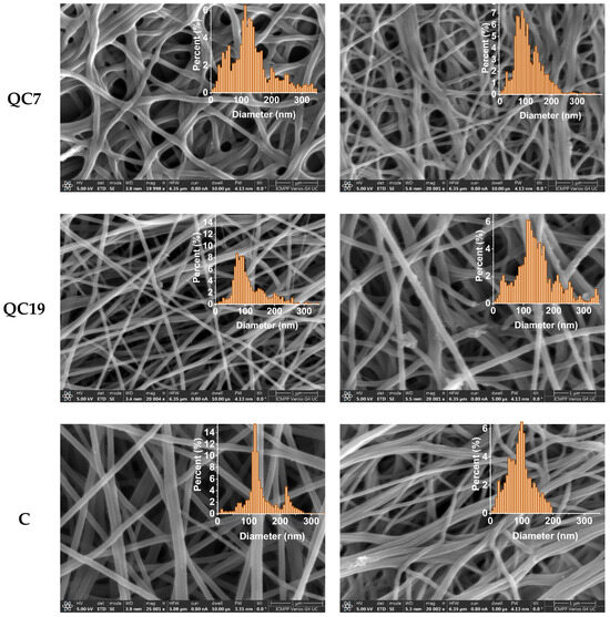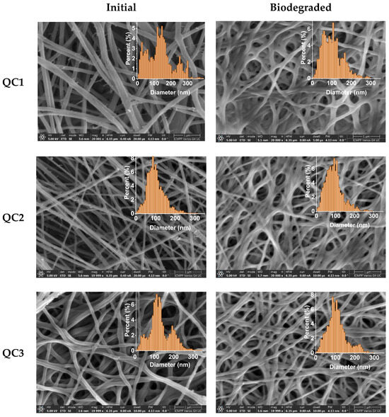 SEM micrographs of the fibers and corresponding histograms before (left) and after (right) the biodegradation experiment (scale bar: 1 µm, mag: 20,000 or 25,000, HV: 5 kV). The apparent dense aspect of the fibers may be the result of the reorganization of the fibers in lysozyme media, an aspect also observed for other chitosan-based nanofibers [24].