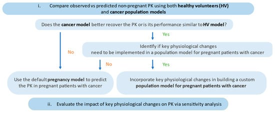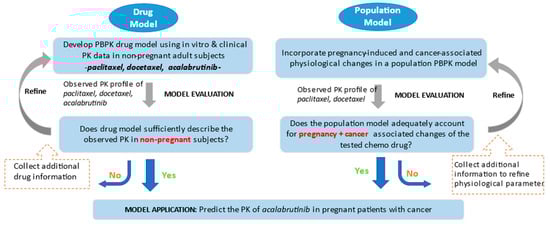 PBPK analysis and clinical PK data in non-pregnant or pregnant patients with cancer, treated with paclitaxel or docetaxel, were used to evaluate the impact of physiological changes of pregnancy and cancer on drug PK. The overall workflow for the development of a population model for pregnant patients with cancer is illustrated in Figure 2.