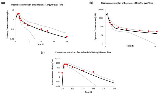 Comparison of PBPK predicted versus observed plasma concentration–time profiles in non-pregnant patients with cancer. (a) Paclitaxel (3 h infusion of 175 mg/m2). Red circles are mean observed PK [35]. (b) Docetaxel (1 h infusion of 100 mg/m2). Red circles are median observed PK (cite reference) [37]. (c) Acalabrutinib (100 mg BID on day 8). Red circles are mean observed PK [38]. Black and grey lines represent the population and 5th–95th percentiles of the predicted mean PK profiles, respectively.