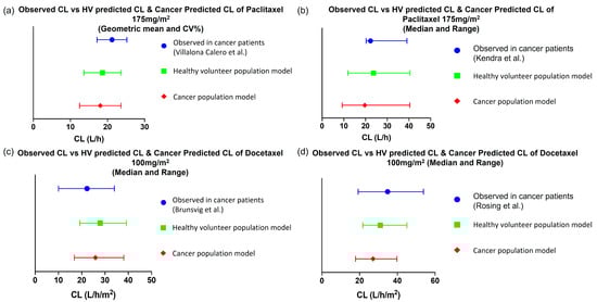 Comparison of observed clearance versus PBPK predictions using the default healthy volunteers or cancer population models. (a) Paclitaxel observed clearance (Villalona-Calero et al. 1999) [35] after single administration of 175 mg/m2 over 3 h. (b) Paclitaxel observed clearance (Kendra et al. 2015) [24] after single administration of 175 mg/m2 over 3 h. (c) Docetaxel observed clearance (Brunsvig et al. 2007) [37] after single administration of 100 mg/m2 over 1 h. (d) Docetaxel observed clearance (Rosing et al. 2000) [39] after single administration of 100 mg/m2 over 1 h.