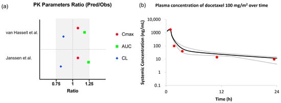 The predictive PK performance of the docetaxel drug model (Supplemental Materials Section S2, Table S6a) was evaluated via comparison with PK data from two clinical studies of docetaxel at doses of 100 mg/m2 in non-pregnant patients with cancer [37,39]. The model predictions for Cmax, AUC, and CL were around 20% of the reported values in both studies (Table S6a). Representative predicted versus observed plasma concentration-time profiles after a single 1 h IV infusion of docetaxel 100 mg/m2 are shown in Figure 3b.