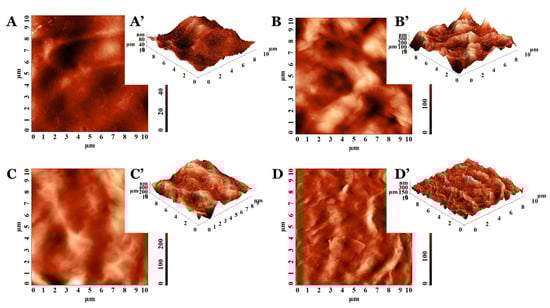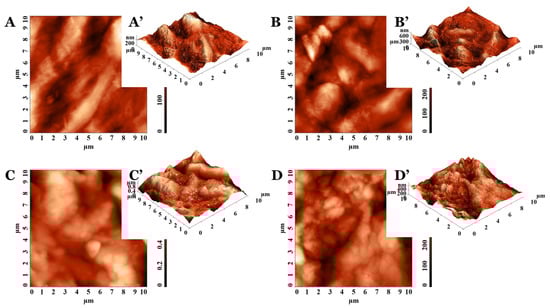 The 2D and 3D AFM images collected on (A,A’) PVA145000, (B,B’) PVA145000_PEBSA25/75, (C,C’) PVA145000_PEBSA50/50, and (D,D’) PVA145000_PEBSA75/25.